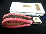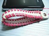 白のクロコ型押しレザーに、レッドピンクの革ひもかがり。内側は、ピンクの型押しレザー。取り付けひもは、蛍光ピンク。 *携帯電話は、参考で付属しません。 |