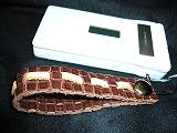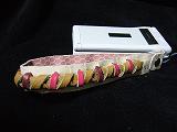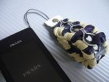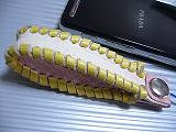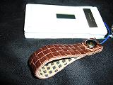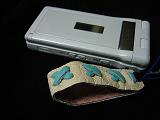 白のクロコ型押しレザーに、黒革ひもかがり。内側は、ピンクの型押しレザー。取り付けひもは、ブルー。 *携帯電話は、参考で付属しません。 |