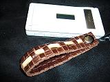 miniサイズのストラップです。1センチ×7センチ。ブラウンの型押しレザーのセンターにクリームレザーを通す。裏地は、ベージュ。紐は、ブルー。*携帯電話は、参考で付属しません |