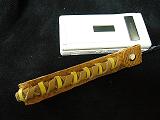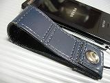 表面は、ダークブルーの合皮でステッチが入ったような型押しレザー、内側は、ブラックの本革で、トカゲ系の型押しです。幅が2.5センチサイズの幅広デザインです。濃いブルーに合うように、大きめのクロムリベットを使って仕上げています。 落ち着いた感じのシンプルデザインです。 *携帯電話は、付属しません。 |