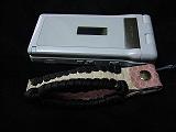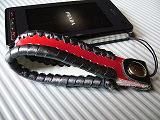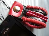 ブラックメタリックにチェックの型押しをしたレザーを表裏に使い、周囲をレッドの革ひもでかがっています。 トップは、パール発色のあるレッドのレザーを使用。 装飾は、本体に当たるレザーのセンターをカットして、プラスティックのレッドスプリングを通し、革ひもで固定をしています。 小ぶりですが、幅が3センチと幅広デザインになっています。 *携帯電話は、付属しません。 |