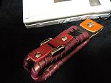 チェック柄の型押しでブラックメタリック色のレザーをベースに、周囲をパール発色のワインレッドの革ひもでかがりました。装飾に、バックルパーツの端部にレッドレザーをつけて固定しています。トップのレザーは、オレンジを使い、内側は、ライトブラウンのレザーを使った仕様です。 *携帯電話は、参考で付属しません。 |