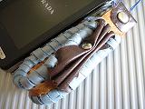 淡いブルーにパール発色のあるレザーを表側に使い、内側とトップに、スーパーホワイトのクロコ型押しレザーを使い、明るさを出しています。周囲は、スカイブルーの革ひもを使って同系色で合わせています。センターに、ポイントアクセントで、ブラックレザーをかがっています。 *携帯電話は、付属しません。 |