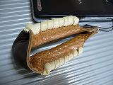 ブラウンの型押しレザーに、クリームの革ひもかがり、裏地は、起毛加工レザー仕様 トップは、ブラウンの型押しレザーで飾り付け。 *携帯電話は、参考で付属しません。 |
