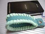 ペパーミントグリーンのパンチングレザーで、パンチングの穴は、表面のみの非貫通です。このレザーを表面、内側に使い、周囲をミントグリーンの革ひもでかがっています。 ストラップひもは、ブルーを使用。 *携帯電話は、付属しません。 |