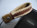 表面は、ブラウンのスエードレザーを使用。 内側は、縦横編み込みの型押しレザーで、レッドとレッドメタリックのカラーを使って、表現されています。 ストラップのトップの部分と周囲のかがりは、ブラウンメタリックレザーを使用しています。 ストラップひもは、ブラックを使用。 *携帯電話は、参考で付属しません。 |
