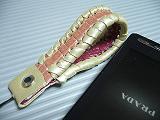 表面は、縦ラインの溝に、等間隔で、四角のデザインがある型押しホワイトレザーを使用。 内側は、レッドレザーを使用しています。 ストラップのトップの部分と周囲のかがりは、ワインレッドのレザーで仕上げています。 ストラップひもは、ブラックを使用。 *携帯電話は、参考で付属しません。 |