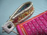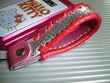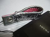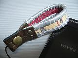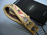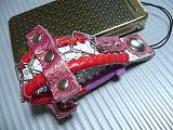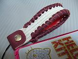 | 説明 | 表面は、レッドレザーを使用しています。 内側は、細かい四角をモチーフに、チェック柄をデザインしたものを型押しをしたシルバーレザーを使用。 トップの部分とストラップ周囲のかがりは、パープルレザーを使用し、仕上げています。 ストラップひもは、ブラックを使用。 *携帯電話は、参考で付属しません。 |