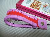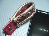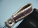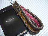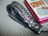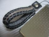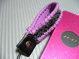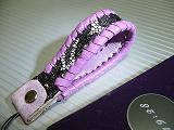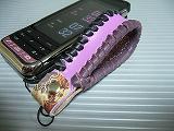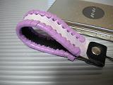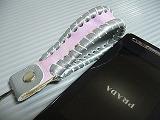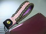 表面は、クロコ柄型押しのピンクレザーを使用しています。内側は、パープルレザーを使用しました。 トップの部分は、ブラックレザーです。 ストラップ周囲のかがりは、アッシュブラウンのレザーを使用して仕上げています。 ストラップひもは、ブラックを使用。 *携帯電話は、参考で付属しません。 |