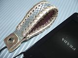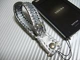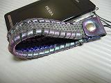 表面は、シルバーメタリックのレザーを使用しています。 内側は、パープルのレザーを使用しています。 トップの部分は、ブラックレザーを使用しています。 ストラップ周囲は、薄いピンクとブラック、2種類のレザーをつなげたもので、かがり仕上げをしています。 ストラップひもは、ブラックを使用。 *携帯電話は、参考で付属しません。 |