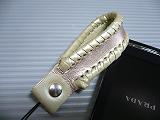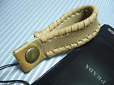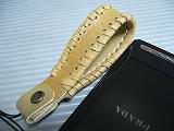 表面は、細かく溝を入れたデザインの型押しホワイトレザーで、薄くゴールドカラーがのせてあるものです。 見た目は、クリームっぽいカラーに見えます。 内側と周囲のかがりは、カーキのレザーを使用しました。 トップの部分は、ブラウンのスエードレザーを使用しています。 ストラップひもは、ブラックを使用。 *携帯電話は、参考で付属しません。 |