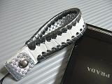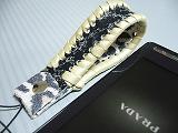表面と周囲のかがりは、ブラックレザーを使用しています。 内側とトップの部分は、ホワイトトカゲの柄を型押しをしたレザーを使用しています。 ストラップひもは、ブラックを使用。 *携帯電話は、参考で付属しません。 |