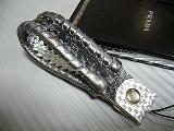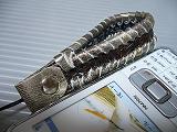 表面は、クロコ柄型押しのシルバーレザーを使用。 内側は、細かい四角で、チェック柄を構成したデザインの型押しレザーを使用しました。 このレザーは、発色感のあるシルバーレザーです。 トップの部分は、ブラウンのスエードレザーを使用しました。 ストラップ周囲は、グレープのような色合いのパープルの革ひもで、かがり仕上げをしています。 ストラップひもは、ブラックを使用。 *携帯電話は、参考で付属しません。 |