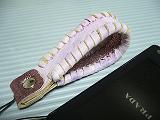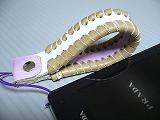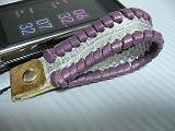 表面は、クロコ柄型押しのホワイトレザーを使用。 トップの部分と内側は、パープルカラーをぼかして染めた加工のレザーを使用しています。 ストラップ周囲は、ベージュの革ひもで、かがり仕上げをしました。 ストラップひもは、濃いパープルカラーのものを使用しています。 *携帯電話は、参考で付属しません。 |