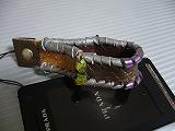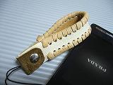 | 説明 | 表面は、籐細工の編み込み柄を型押ししたブラウンのレザーを使用。 内側は、ブラックレザーで、擦れた様なデザインの加工が施されたものを使用しています。 トップの部分と周囲のかがりは、ゴールドカラーに、ブラウン系のカラーで、まだらにぼかしを入れたようなレザーを使用して ストラップひもは、ブラックを使用。 *携帯電話は、参考で付属しません。 |