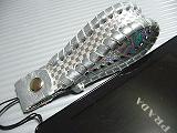 表面は、立体感のある縦横編み込み柄を型押しをしたホワイトレザーを使用。 内側は、細かい四角でチェック柄をデザインした型押しシルバーレザーを使用しました。 ストラップ表面には、大きな四角と小さな四角をつないだ金属パーツを装飾で使用しています。 金属パーツは、両端部に、丸管を取り付けて、レザーを通し、固定しています。金属パーツの左右中間部分に、動き止めとして、レザーで固定しています。 トップの部分と金属パーツの固定は、メタリックカラーのレッドレザーを使用しています。 ストラップ周囲は、レッドとパープルのレザーをつないで、左右交互に配置をしています。 ストラップひもは、ブラックを使用。 *携帯電話は、参考で付属しません。 |