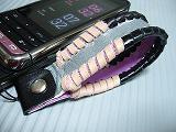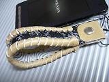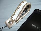 表面は、縦ラインの溝に、等間隔で、四角のデザインがある型押しホワイトレザーを使用。 内側とトップの部分は、ブラックレザーを使用しました。 ストラップ周囲のかがりは、パープルの革ひもを使用し仕上げています。 ストラップひもは、ブラックを使用。 *携帯電話は、参考で付属しません。 |
