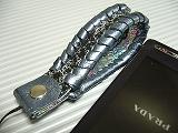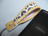 表面は、レザーに、着物のような和柄をデザインしたものを使用しています。内側とトップの部分は、ピンクのカラーをモチーフにデザインした豹柄のバックスキン調レザーを使用しました。 ストラップ周囲のかがりは、アルミ発色のあるブルーレザーを使用して、仕上げました。 ストラップひもは、ブラックを使用。 *携帯電話は、参考で付属しません。 |