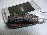 表面と周囲のかがりは、茶系にオレンジが入ったカラーのレザーを使用しています。 内側とトップは、シルバーメタリックのレザーを使用しました。 ストラップひもは、ブラックを使用。 *携帯電話は、参考で付属しません。 |