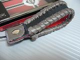 表面は、擦れた感じを出したデザインのブラックレザーを使用しています。 内側の部分は、レッドとレッドメタリックのカラーで、編み込み柄をデザインした型押しレザーを使用しています。 トップの部分とストラップ周囲のかがりは、グレーメタリックのレザーを使用。 ストラップひもは、ブラックを使用。 *携帯電話は、参考で付属しません。 |