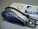 表面は、細かい四角をモチーフに、チェック柄をデザインしたものを型押しをしたシルバーレザーを使用しています。 内側は、アルミ発色のブルーレザーを使用しています。 トップの部分は、グレーメタリックレザーを使用しています。 ストラップ周囲のかがりは、ブラックレザーとアルミ発色のあるブルーレザーをストラップの中間でつなぎ、かがり仕上げをしています。 かがりは、左右で交互の配置のデザインとしています。 ストラップひもは、ブラックを使用。 *携帯電話は、参考で付属しません。 |