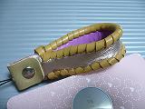 表面は、2枚のレザー端部に、かがり穴を開けて、イエローがかったゴールドの革ひもで、かがりをして、つないでいます。 トップ側が、カーキのレザーに、草木の柄を型押しをしたものを使用しています。下側の曲面部分は、ステッチを入れたようなデザインを型押しをしたゴールドレザーを使用しています。 ストラップ内側は、ブラウンのレザーを使用。 トップの部分は、表面の曲面部分と同じ、ステッチを入れたような型押しゴールドレザーを使用しています。 ストラップ周囲のかがりは、シルバーメタリックのレザーとレインボー発色のあるパープルのレザーをつないで、かがりをしています。 ストラップひもは、ブラックを使用。 *携帯電話は、参考で付属しません。 |