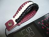 表面は、パール発色のあるピンクが少し入ったカラーのレッドレザーを使用しています。 トップの部分と内側は、ブラックレザーを使用しました。 ストラップ周囲のかがりは、レッドとブラックの革ひもをつないで、かがり仕上げをしました。 ストラップひもは、ブラックを使用。 *携帯電話は、参考で付属しません。 |