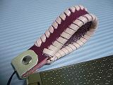 表面は、ホワイトトカゲ柄を型押しをしたレザーを使用しています。 トップの部分と内側は、ワインレッドのレザーを使用しました。 ストラップ周囲は、ブラックとワインレッドのレザーをつないで、かがっています。 左右のかがりは、ブラックとワインレッドを交互に配置し、つなぎの部分は、左右で、長さを変えています。 ストラップひもは、ブラックを使用。 *携帯電話は、参考で付属しません。 |