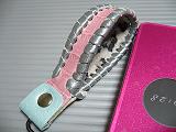 表面は、ピンクゴールドのレザーを使用しています。 内側は、カラーボールをデザインしたプリントレザーを使用しています。 トップの部分と周囲のかがりは、パール発色のあるスカイブルーのレザーを使用しました。 ストラップひもは、ブラックを使用。 *携帯電話は、参考で付属しません。 |