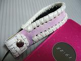 表面は、クロコ柄型押しのホワイトレザーを使用しています。 内側は、薄いピンク系の豹柄のレザーをしようしました。 トップの部分と周囲のかがりは、ピンクゴールドのレザーを使用し、仕上げています。 ストラップひもは、ブラックを使用。 *携帯電話は、参考で付属しません。 |
