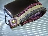 表面は、パープルレザーを使用。 内側は、アルミ発色のあるレッドレザーを使用。 トップの部分は、着物のような和柄デザインのレザーを使用しました。 ストラップ周囲は、かがり仕上げで、カラーを左右で、変えています。 片側が、ブラックで、対面がグレープのようなカラーのパープルレザーを使用し、仕上げています。 ストラップひもは、ブラックを使用。 *携帯電話は、参考で付属しません。 |