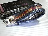 表面は、ブラックレザーで、ジーンズの擦れた加工のように、デザインをしたレザーを使用しています。内側とトップの部分は、細かい四角をモチーフに、チェック柄をデザインしたものを型押しをしたシルバーレザーを使用。 ストラップ周囲は、黒みのあるシルバーレザーで、かがり仕上げをしています。 ストラップひもは、ブラックを使用。 *携帯電話は、参考で付属しません。 |