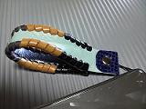 表面は、パール発色のあるスカイブルーのレザーを使用しています。 内側は、アルミカラーの発色感があるブルーレザーです。 トップの部分は、パープルレザーに、鱗の柄をプリント加工したレザーを使用しました。 ストラップ周囲は、ブラック、キャラメル、アッシュグレーの3種類です。 ストラップひもは、ブラックを使用。 *携帯電話は、参考で付属しません。 |