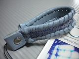 表面は、ブラックベースに、グレーのクロスラインのあるデザインの型押しレザーを使用しています。 内側とトップの部分は、ホワイトグレーをベースに、 ブルーカラーで、デジタルノイズのようなデザインを表現した、レザーを使用しています。 周囲のかがりは、メタルブルーのレザーとグレーレザーをつないで使用しています。 曲面の部分が、グレーで、その両端が、メタルブルーの配置に、なっています。 ストラップひもは、ブラックを使用。 *携帯電話は、付属致しません。 |