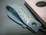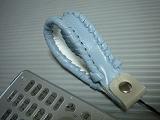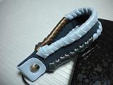 2つのレザーパーツの端部に、かしめ金具を打ってつないでいます。 表面の輪の部分は、ライトブルーのレザーを使用。 内側は、ライトグレーのスエードレザーに、ウエーブ状のデザインをプリント加工した、レザーを使用しています。 トップの部分は、表面、内側ともに、ホワイトレザーを使用しています。 周囲の部分は、本体側が、ホワイトクリームレザー、トップ側が、ライトブラウンのレザーで、かがりをして、仕上げました。 ストラップひもは、ブラックを使用。 *携帯電話は、付属致しません。 |