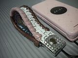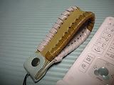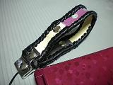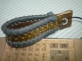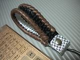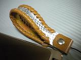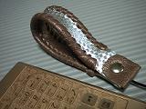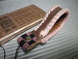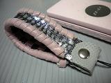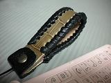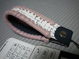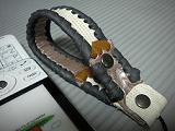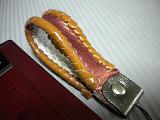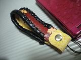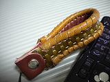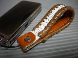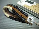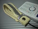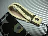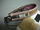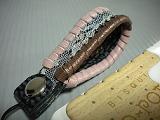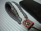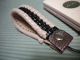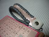 ストラップは、4つのレザーパーツをかしめ打ちで、つないだデザインになっています。 トップの部分は、表面、内側ともに、メタルシルバーレザーを使用しています。 中間のパーツは、表面が、編み込みデザイン型押しのホワイトレザーを使用。 内側は、細い溝のラインを型押した、ブラックメタリックレザーを使用。 輪の部分のパーツは、表面が、キャメルブラウンレザーを使用。 内側は、ピンクの入ったレッドカラーのレザーに、シルバーの水玉プリン加工が施してあるレザーを使用しました。 ストラップ周囲は、ピンクレザーとパールブラウンレザーをつないで、かがり仕上げをしました。 ストラップひもは、ブラックを使用。 *携帯電話は、付属致しません。 |