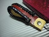 表面は、ブラックメタリックのレザーに、細い溝を入れた、型押しレザーを使用しています。 内側は、ライトグレーパンチングレザーを使用しました。 トップの部分は、編み込みデザインを型押した、レッドレザーを使用。 周囲の部分は、ピンク、ライトブラウン、ピンクの入ったレッドの3種類をつないで、かがりをしています。 左右の配置は、互い違いにしています。 ストラップひもは、ブラックを使用。 *携帯電話は、付属致しません。 |