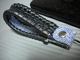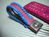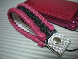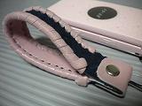 表面は、編み込みデザインを型押しをした、ダークブルーのレザーを使用しています。 内側、トップの部分、周囲のかがりは、ピンクレザーを使用しました。 ストラップひもは、ブラックを使用。 *携帯電話は、付属致しません。 |