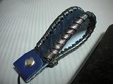 表面は、編み込みデザインを型押しをした、ダークブルーレザーを使用しました。 内側は、ライトブルーのレザーを使用。 トップの部分は、ブルーレザーを使用しました。 周囲の部分は、等間隔に、細い溝のある型押しガンメタリックレザーを使用し、かがり仕上げをしました。 ストラップひもは、ブラックを使用。 *携帯電話は、付属致しません。 |