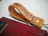表面は、レッドとゴールドを使ったデザイン柄のレザーを使用しています。 内側は、オレンジブラウンのレザーを使用しました。 トップの部分と周囲のかがりは、ライトブラウンのレザーを使用して、仕上げました。 ストラップひもは、ブラックを使用。 *携帯電話は、付属致しません。 |