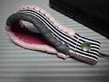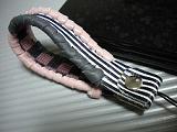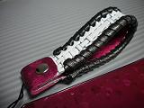 表面は、ホワイトとブラックのストライプ柄デザインを型押しをした、レザーを使用しています。 凸の部分がブラック、ホワイトの部分が、凹になっています。 内側と周囲のかがりは、ピンクレザーを使用して、仕上げました。 ストラップひもは、ブラックを使用。 *携帯電話は、付属致しません。 |