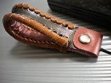 表面は、オレンジブラウンのレザーを使用しています。 内側は、ブラウンレザーに、ゴールドカラーで、ウエーブ状のカラーデザインをプリント加工したレザーを使用しました。 トップの部分は、厚手の染色レッドのレザーを使用しました。 周囲の部分は、ライトブラウンのレザーで、かがりをして、仕上げています。 ストラップひもは、ブラックを使用。 *携帯電話は、付属致しません。 |