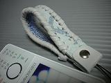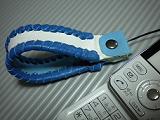 表面は、ホワイトレザーを使用。 内側は、細かい線の入った型押しのスカイブルーレザーを使用。 トップの部分は、型押しでないフラットなスカイブルーレザーを使用しました。 周囲は、オーシャンブルーのレザーで、かがり仕上げをしました。 ストラップひもは、ブラックを使用。 *携帯電話は、付属致しません。 |
