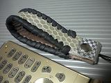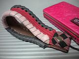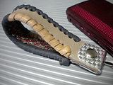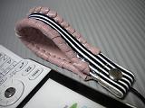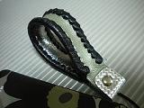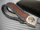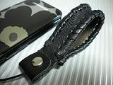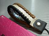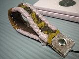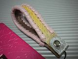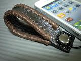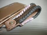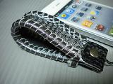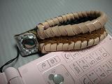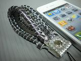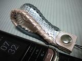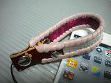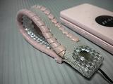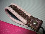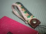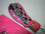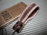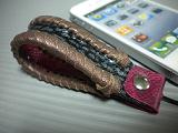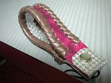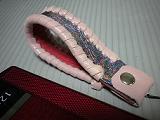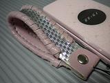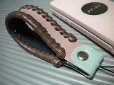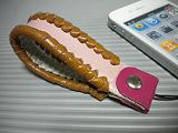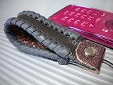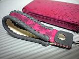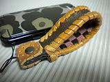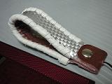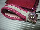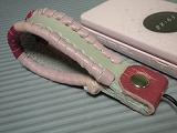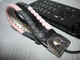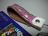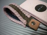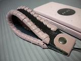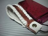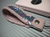 ホワイトトカゲデザインを型押したレザーとピンクメタリックレザーを表面と内側に、交互につないで、使用しています。 ストラップ周囲の部分は、グレーレザーで、かがりをしています。 レザーのつなぎの部分は、ライトブラウンレザーでのかがりとかしめ打ちにて、固定しています。 ストラップひもは、ブラックを使用。 *携帯電話は、付属致しません。 |