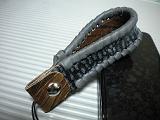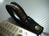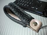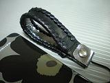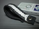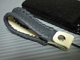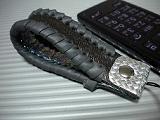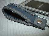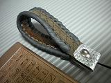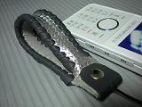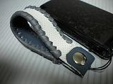 表面は、線を入れたような型押しに、グレーのクロス線を入れたブラックレザーを使用しています。 内側は、艶消しブラックレザーを使用しました。 トップの部分と周囲のかがりは、グレーレザーを使用しています。 ストラップひもは、ブラックを使用。 *携帯電話は、付属致しません。 |