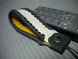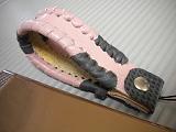 表面は、ライトブラウンパンチングレザーを使用。 内側は、スニーカーの靴底のような、幾何学的な溝を型押した、ブラウンレザーを使用しました。 トップの部分は、パールブラウンレザーを使用。 周囲の部分は、イエローレザーで、かがり仕上げをしています。 ストラップひもは、ブラックを使用。 *携帯電話は、付属致しません。 |
