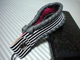 表面は、ホワイトとブラックのストライプ柄デザインを型押しをした、レザーを使用しています。 凸の部分がブラック、ホワイトの部分が、凹になっています。 内側は、スネークデザインを型押しをした、レッドレザーを使用しています。 周囲の部分は、グレーレザーで、かがり仕上げをしています。 ストラップひもは、ブラックを使用。 *携帯電話は、付属致しません。 |
