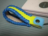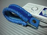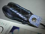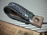 ストラップは、本体端部に、レザーパーツをかしめ打ちで、固定をして、つないでいます。 本体表面は、ブラックメタリックのレザーに、細い溝を入れた、型押しレザーを使用しています。 本体内側は、ブルーのデジタルノイズのようなデザインレザーを使用しています。 アルミカラーのブルーなので、角度によって、独特な発色感があります。 周囲の部分は、ピンクレザーで、かがりをしています。 トップ側、表面は、ブルースネークデザインの型押しレザーを使用。 トップ側、内側は、本体表面と同じものを使用しています。 ストラップひもは、ブラックを使用。 *携帯電話は、付属致しません。 |