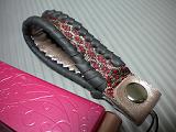 輪の部分とトップの部分の2つのパーツをかしめ打ちで、固定しています。 表面の輪の部分は、細かい四角で、チェック柄を表現したデザインの型押し、シルバーレザーを使用しています。 内側は、レッドスネークデザインの型押しレザーを使用しています。 トップの部分は、表面と内側ともに、素地のレザーに、花柄を残し、ワインレッドで染色したものを使用しています。 周囲の部分は、ピンクレザーで、かがりをして、仕上げました。 ストラップひもは、ブラックを使用。 *携帯電話は、付属致しません。 |