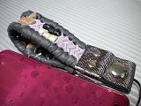 表面は、ブラックベースに、グレーメタリックの斑点があるデザインレザーを使用。 内側とトップの部分は、ピンクメタリックレザーを使用しました。 周囲の部分は、グレーレザーで、かがりをして、仕上げました。 ストラップひもは、ブラックを使用。 *携帯電話は、付属致しません。 |